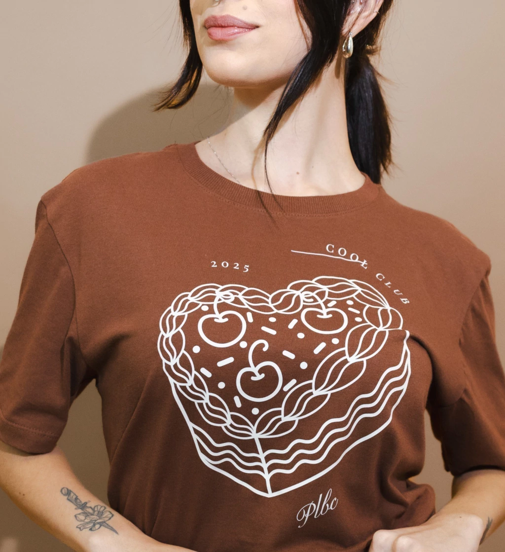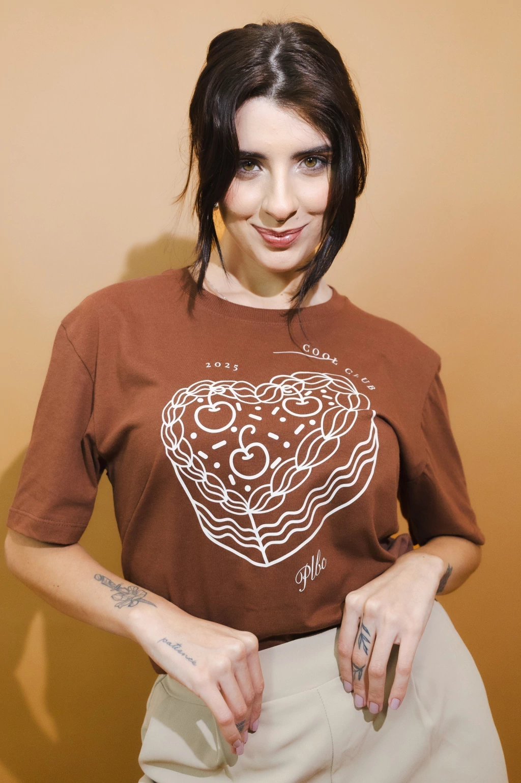 Essa camiseta na cor marrom é um verdadeiro encanto! Ela transmite uma sensação de charme, perfeita para qualquer estação. A estampa de bolo de cereja em formato de coração é o destaque da peça, trazendo um toque divertido ao visual. O bolo, ilustrado, com cerejas, formando um coração que combina com a vibe calorosa e adorável da camiseta.